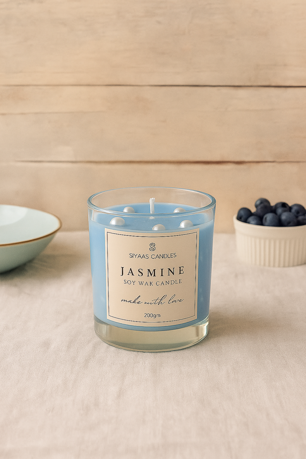 Our hand-poured Siyaas Small Jasmine Soy Wax Candle. Designed for intimate moments and everyday relaxation, this elegant candle adds warmth and freshness to any room.